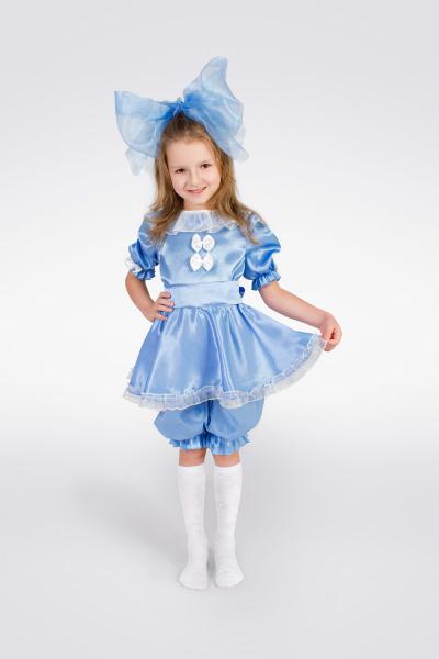 В карнавальный костюм на девочку Мальвина входит: платье, бриджи, пояс и бант. Костюм выполнен в голубом цвете.